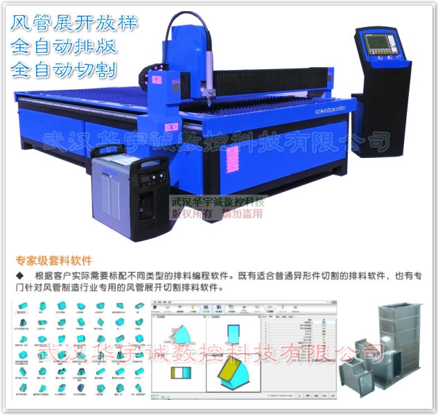所謂的風(fēng)管我們可以按按截面形狀,風(fēng)管可分為圓形風(fēng)管,矩形風(fēng)管,扁圓風(fēng)管等多種,其中圓形風(fēng)管阻力小的高度尺寸大,制作復(fù)雜。所以應(yīng)用以矩形風(fēng)管為主。按材質(zhì),風(fēng)管可分為金屬風(fēng)管,復(fù)合風(fēng)管,索斯風(fēng)管等。當(dāng)今市場(chǎng)上等離子風(fēng)管切割下料設(shè)備繁多,那么今天華宇誠(chéng)數(shù)控科技有限公司就本公司生產(chǎn)的風(fēng)管下料切割機(jī)其中的一種設(shè)備數(shù)控等離子風(fēng)管切割機(jī)做個(gè)簡(jiǎn)單介紹:全自動(dòng)風(fēng)管等離子切割機(jī)主要是完成部件的自動(dòng)化放樣和切割,只需要要在2維或3維圖形中輸入想要的尺寸,軟件就可以自動(dòng)套料,然后等離子切割機(jī)可以自動(dòng)將圖形切割機(jī)出來(lái)。法蘭、咬口、大板拼接的預(yù)留量電腦都能自動(dòng)計(jì)算。